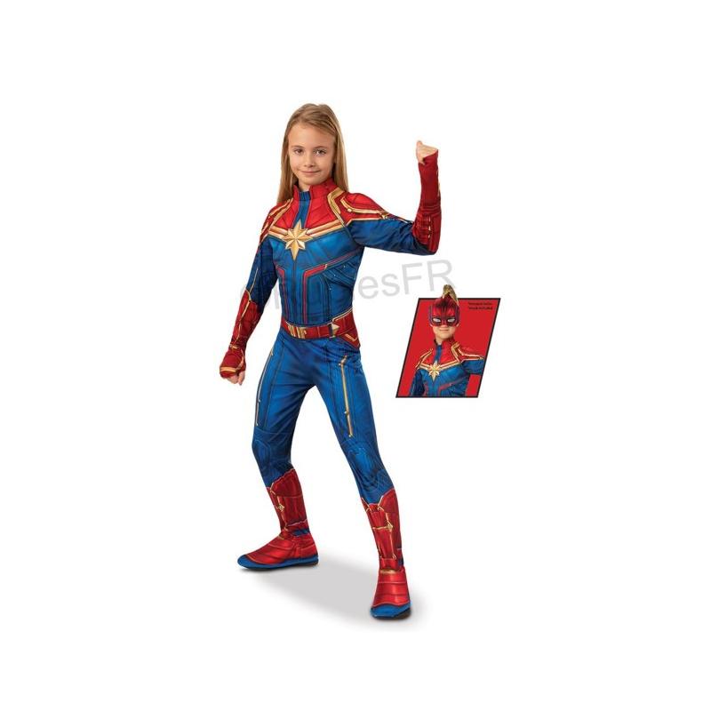 Combinaison de l?héroïne Captain Marvel avec : Impression rouge et bleue et logo étoile sur le top - Sur-bottes intégrées - Demi-cagoule en mousse imprimée assortie.