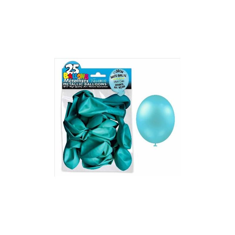 Ballons, 100 % latex, aspect metal couleur bleu ciel , gonflage air ou hélium ; lot de 25 ballons.